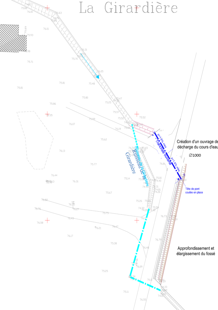 Une étude menée par le SY.M.B.O.L.I.P. a permis d’identifier le sous-dimensionnement de l’ouvrage sous la route départementale reliant Pouancé à Saint Aignan sur Roe comme principale cause aggravante de ces débordements. Les débits importants apportés par le bassin versant amont ne parvenaient pas à franchir les ouvrages existants, provoquant l’accumulation d’eau en amont de la route départementale. Ainsi, en octobre 2017, une seconde conduite a été installée sous la route départementale pour assurer une surverse lorsque le ruisseau sort de son lit et permettre le bon écoulement des eaux de crues jusqu’aux crues de type centennale.