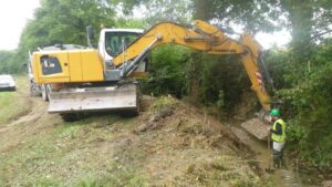 Les travaux de restauration de l’Argos ont débuté le 17 juillet en aval du plan d’eau communal de Chazé-sur-Argos. Sur 150 mètres, les berges sont retalutées en pente douce. Des radiers et des banquettes en cailloux formeront un lit plus dynamique pour accueillir prochainement toute une végétation aquatique. L’évacuation du réseau d’eaux pluviales est traitée pour s’intégrer dans le paysage. Ces aménagements renforceront la vie aquatique de la rivière et stabiliseront les berges fortement dégradées sur ce tronçon.