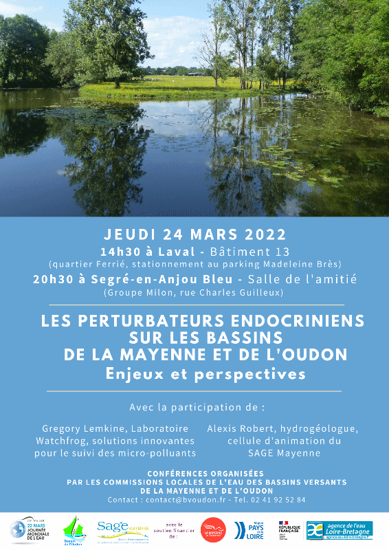 Dans le cadre de la Journée mondiale de l'eau 2022, deux conférences sur le thème des perturbateurs endocriniens le jeudi 24 mars est organisé par les commissions locales de l'eau des bassins versants de la Mayenne et de l'Oudon.