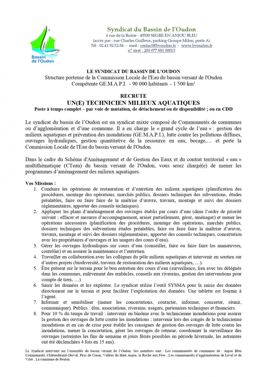 Offre d’emploi : Technicien(ne) milieux aquatiques