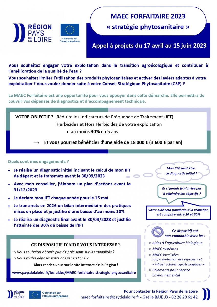 Depuis le 17 avril 2023, la région Pays de la Loire a lancé un appel à projets pour une Mesure Agro-Environnementale et Climatique forfaitaire « stratégie phytosanitaire ». Cette mesure a pour objectif de réduire les indicateurs de fréquence de traitement (IFT) herbicides et hors herbicides des exploitations d’au moins 30% en 5 ans, moyennant une aide de 3600€/an pendant 5 ans.