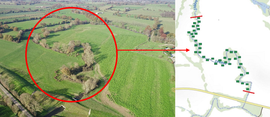 Voici une photo du site où l’opération de piégeage s’est effectué ainsi qu’une carte schématisant la disposition des pièges sur l’ensemble du linéaire :