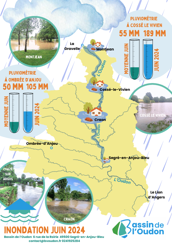 Le bassin versant de l’Oudon vient de subir un évènement pluviométrique très intense le mardi 18 juin 2024 ayant entrainé des crues très dommageables.
