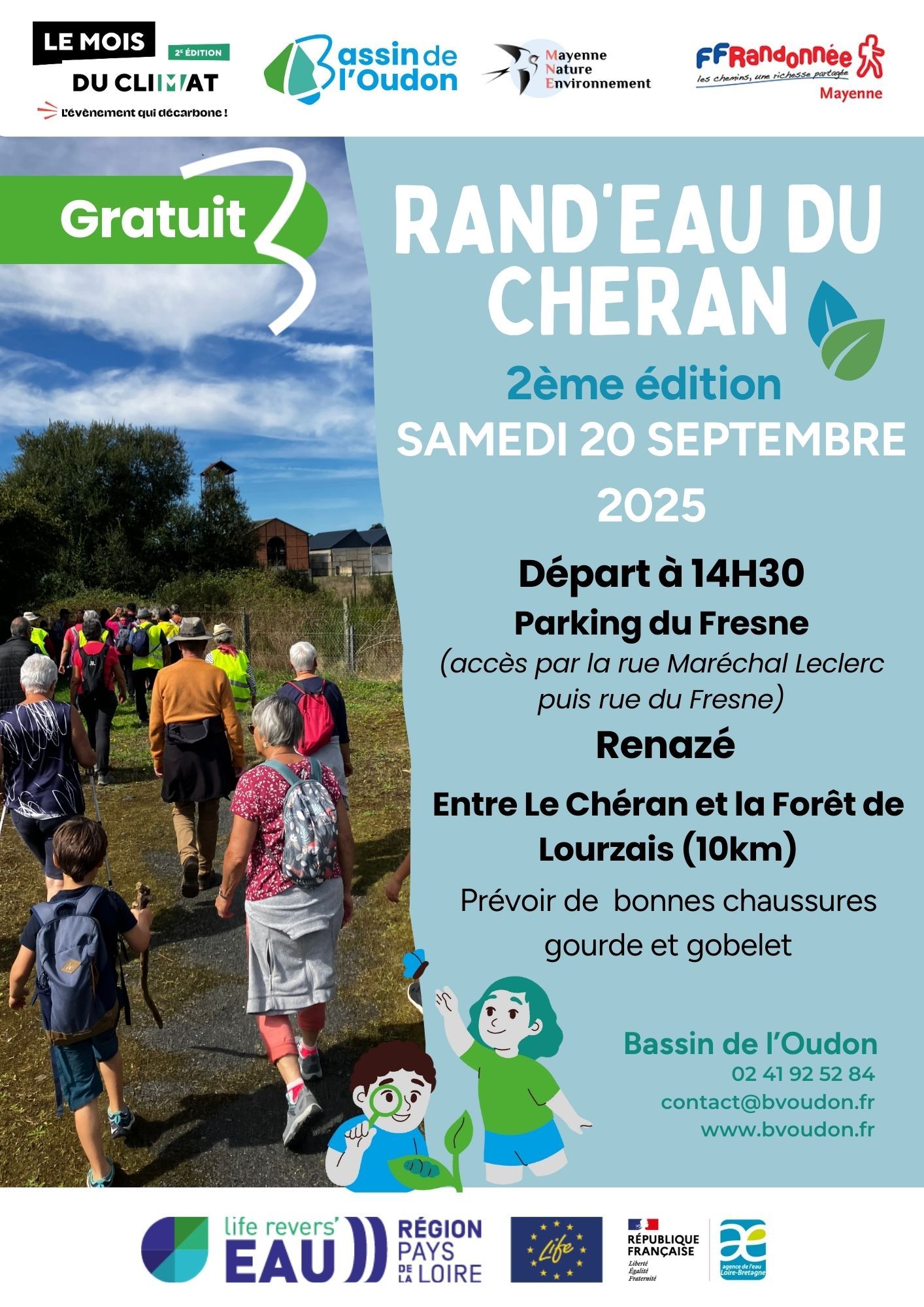 Cette randonnée s’inscrit dans le cadre du programme d’actions LIFE Revers’eau Chéran, financé par la Commission Européenne et l’Agence de l’Eau Loire-Bretagne. Ce programme permet au Syndicat du bassin de l’Oudon, en lien avec les acteurs locaux, de mettre en œuvre différentes actions pour améliorer la qualité de l’eau et des milieux aquatiques sur le bassin versant du Chéran.