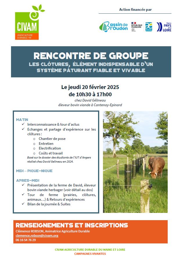 Depuis quelques années, le CIVAM AD 49 anime un groupe d’éleveurs sur le sud du bassin de l’Oudon en partenariat avec le Syndicat. Ce groupe se réunira le jeudi 20 février chez David Gélineau, EARL Les Basses Vallées à Cantenay Epinard. Eleveur bovin de limousines, en système 100% herbe, autonome sur l’alimentation du troupeau, cet agriculteur éclairera ses pairs sur sa gestion des clôtures : matériel, mise en place et déplacement, entretien, coût.