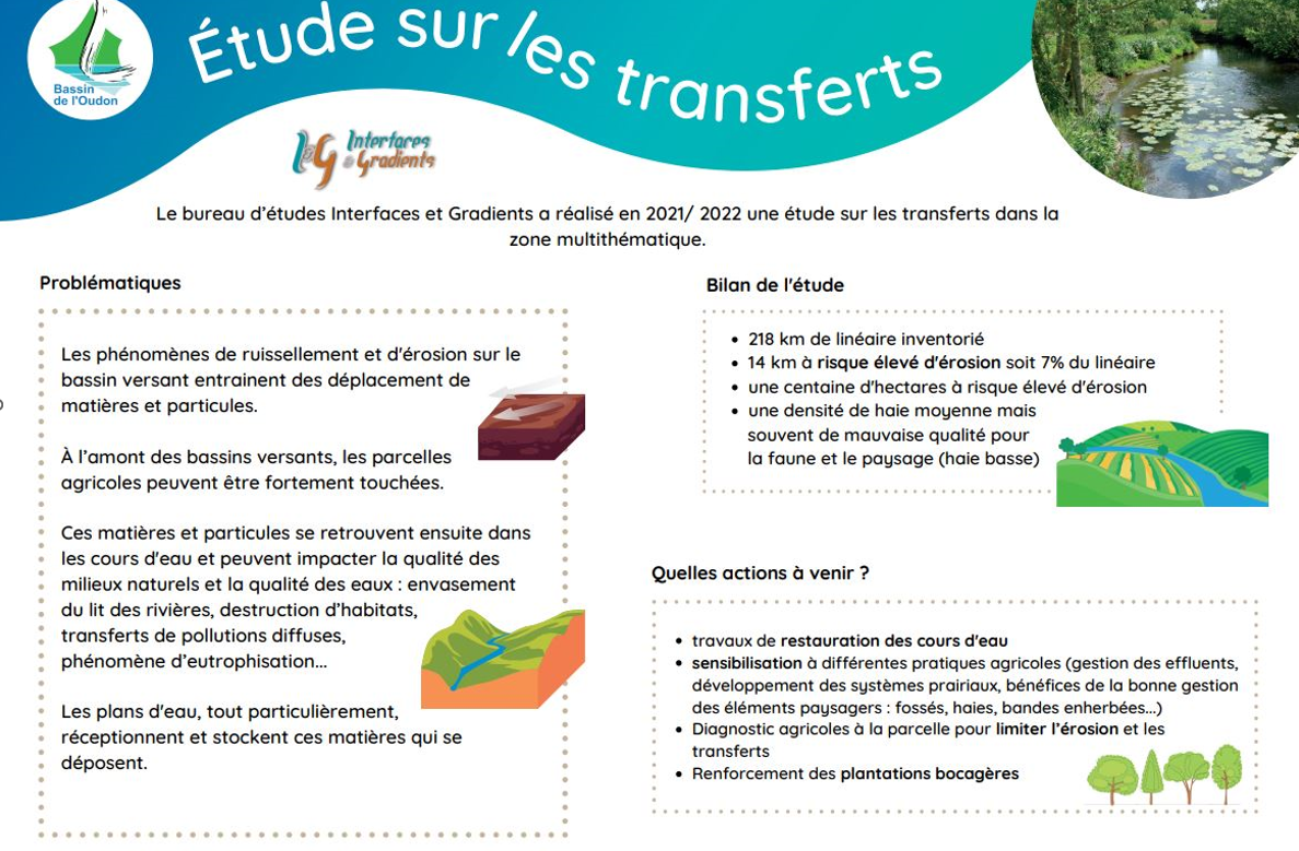 Depuis 2021, une étude sur la problématique Transferts a été réalisé sur les bassins-versants en amont des plans d’eau de Pouancé et de Combrée. Cette étude globale du système avait pour objectif la définition de programmes locaux d’actions multipartenaires visant la réduction des phénomènes d’érosion, de transferts de sédiments et de phosphore, ceci en lien avec les acteurs du territoire et en vue de leur intégration dans le contrat territorial du Bassin de l’Oudon.
