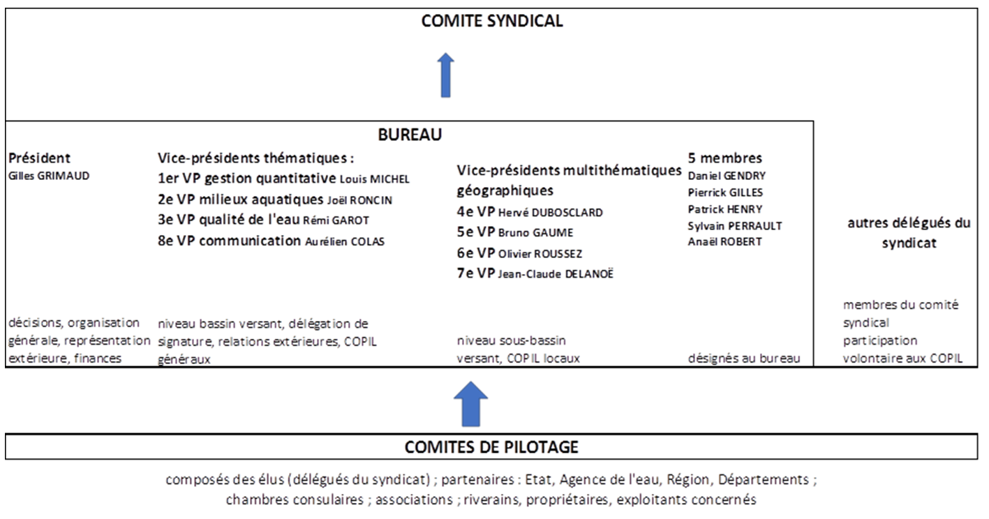 Monsieur Gilles GRIMAUD a été réélu à la Présidence du Syndicat. Il est épaulé par 3 Vice-présidents thématiques ainsi que par 4 Vice-présidents multithématiques répartis géographiquement. Le schéma de gouvernance est le suivant :