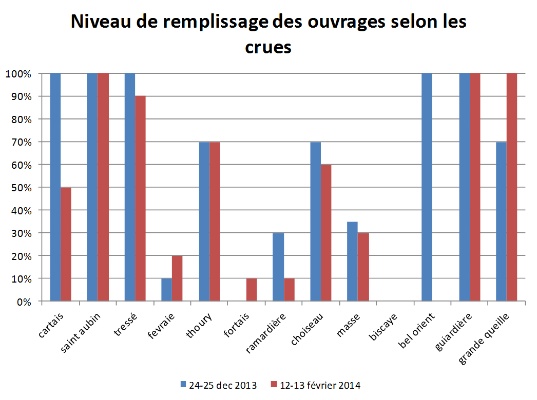 Les ouvrages de sur stockage du Syndicat du Bassin de l’Oudon se sont mis en charge selon leur capacité à l’occasion de ces crues.