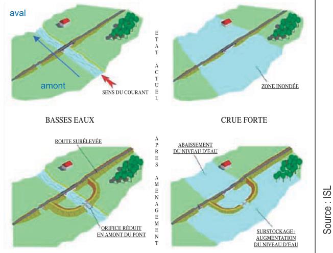 Ainsi, les débordements dans les champs d’expansion de crue sont rétablis à l’aide d’ouvrages qui limitent l’écoulement à des endroits stratégiques du bassin versant. Les volumes d’eau qui contribuaient à alimenter la pointe de crue sont ainsi stockés temporairement puis restitués progressivement à la décrue. L’onde de crue en aval est étalée dans le temps, son pic de crue est réduit et les niveaux d’eau au droit des bâtiments inondables sont abaissés.