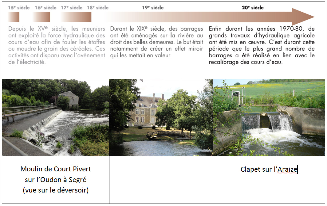 Les rivières du bassin de l’Oudon, comme bien d’autres, ont été aménagées au gré du développement des activités humaines. Ainsi, on dénombre une centaine de barrages sur le territoire du Syndicat de bassin de l’Oudon et en particulier sur les cours d’eau principaux.
