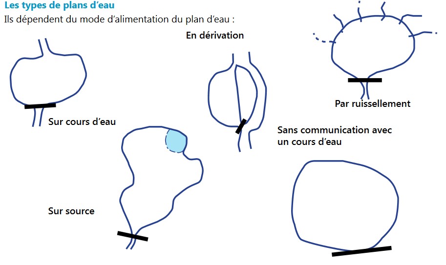 Les typologies de plans d’eau se caractérisent par leur connexion au réseau hydrographique et donc selon le mode d’alimentation en eau.