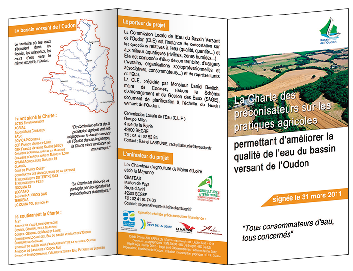La Charte des préconisateurs sur les pratiques agricoles du bassin versant de l’Oudon a été signée une première fois  en 2011.  Elle a été actualisée et signée en 2019 par 20 organismes de conseil présent sur le Bassin de l’Oudon. Cette actualisation a permis d’intégrer les évolutions du contexte agricole, telle la nouvelle directive nitrate, et la notion de gestion quantitative de l’eau, en lien avec le changement climatique. Cette charte entérine l’accord des signataires à promouvoir des conseils communs en faveur de la qualité de l’eau et de sa gestion quantitative.