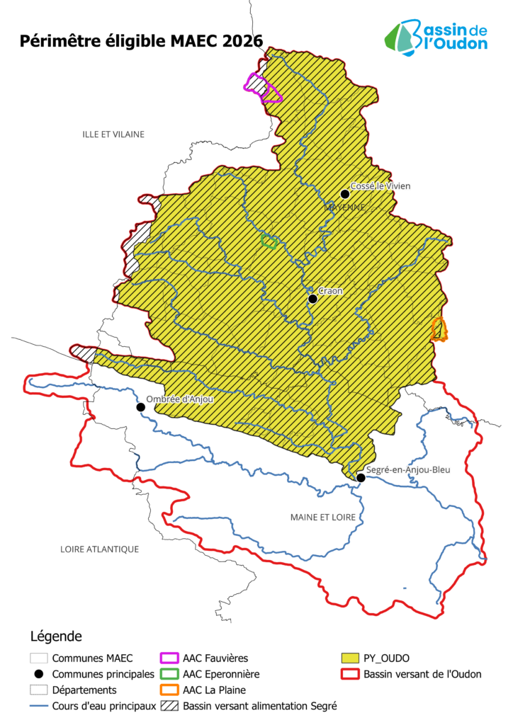 Toute exploitation ayant a minima un bout de parcelle ou une parcelle dans le périmètre ci-après cartographié (bassin de l’Oudon, à l’exception de la CC du Pays de Château-Gontier, sauf captage prioritaire de La Plaine y compris dans sa partie sur le bassin de la Mayenne), est éligible aux MAEC du bassin de l’Oudon