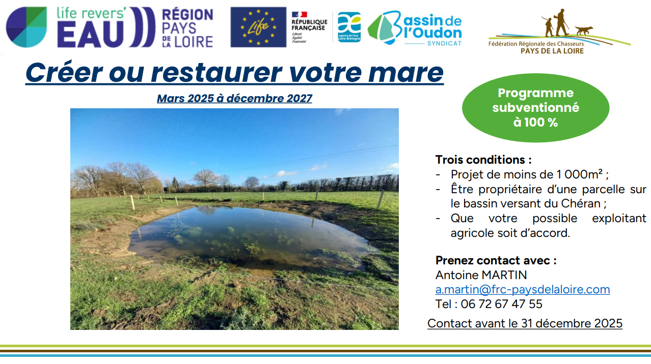 Le Syndicat du bassin de l’Oudon collabore avec la Fédération de Chasse des Pays de la Loire, jusqu’en 2027, pour créer et restaurer des mares sur le bassin versant du Chéran. Plus d’informations en contactant, avant le 31 décembre 2025, Antoine MARTIN : a.martin@frc-paysdelaloire.com / 06 72 67 47 55